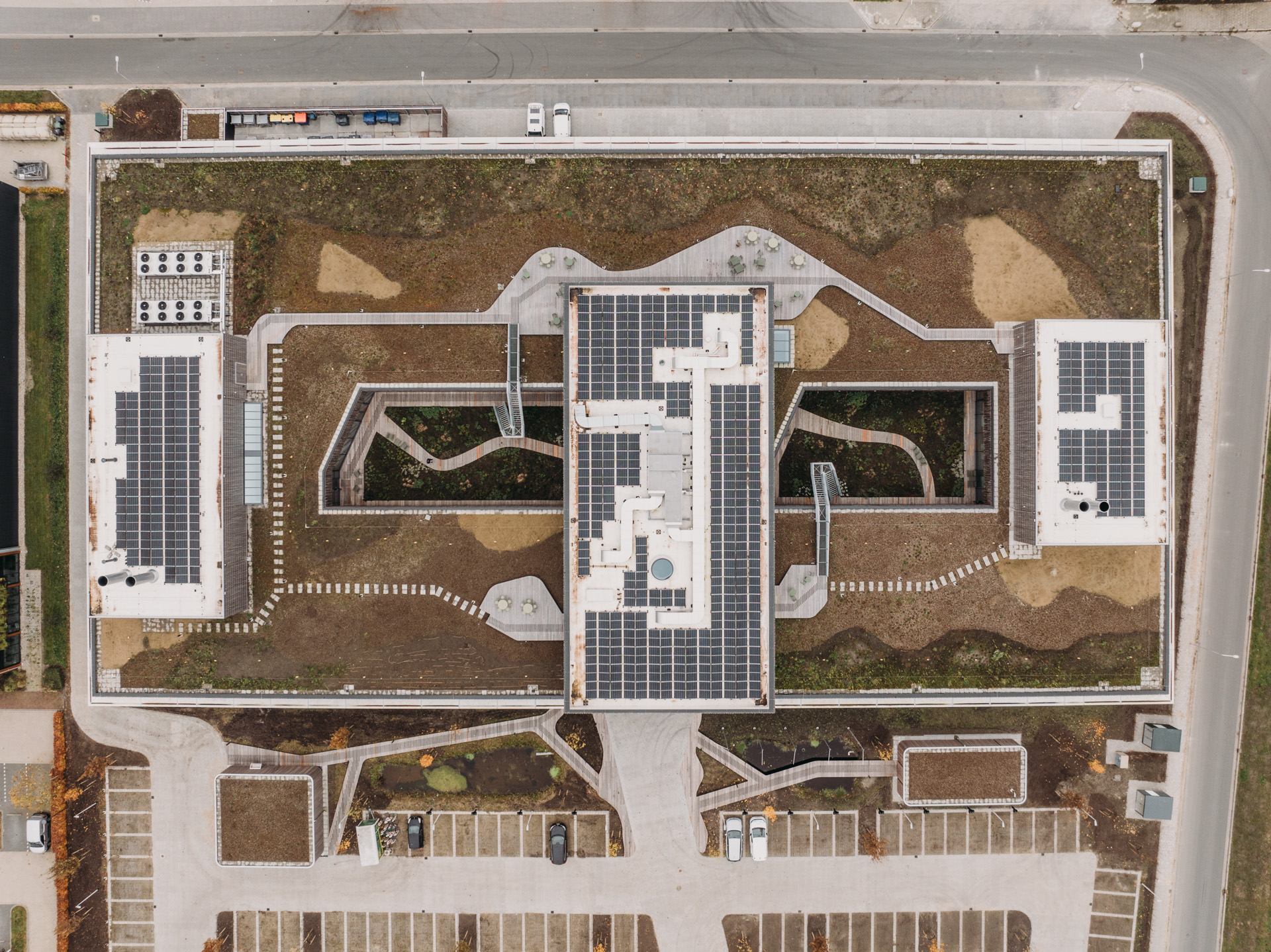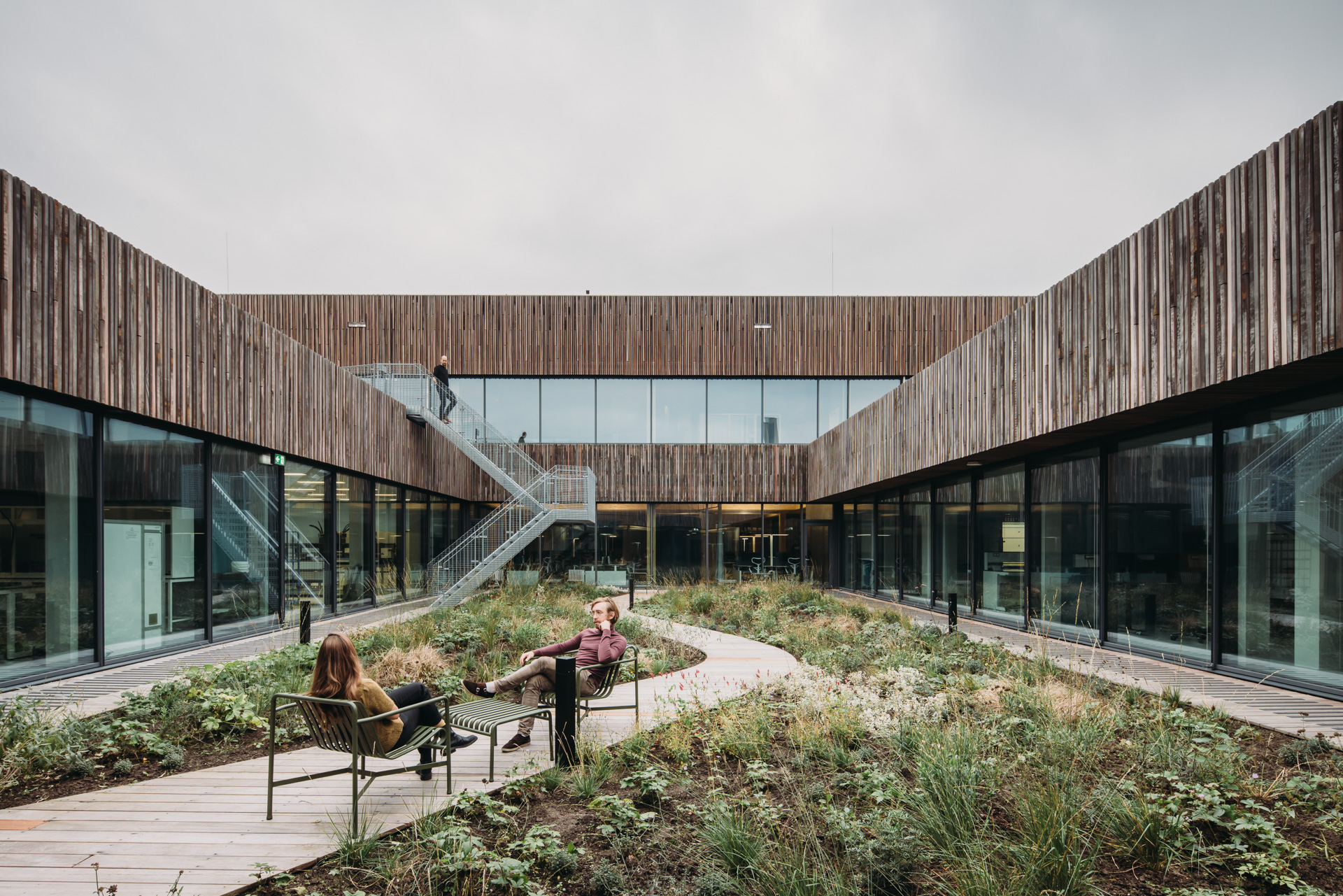 Net zoals de mensen dat voor AQUON zijn, vormen de werkplekken het hart van het gebouw. Deze strategische ligging van de kantoor- en vergaderfuncties zorgt voor de verbinding, zowel fysiek als visueel, van mensen en processen. Het kantoorgebied wordt geflankeerd door twee grote patio’s die daglicht binnenbrengen en visuele verbinding geven met de lab- en uitwerkruimtes, die symmetrisch op beide vleugels zijn gepositioneerd. Deze patio’s geven ook direct toegang de daktuin erboven.
