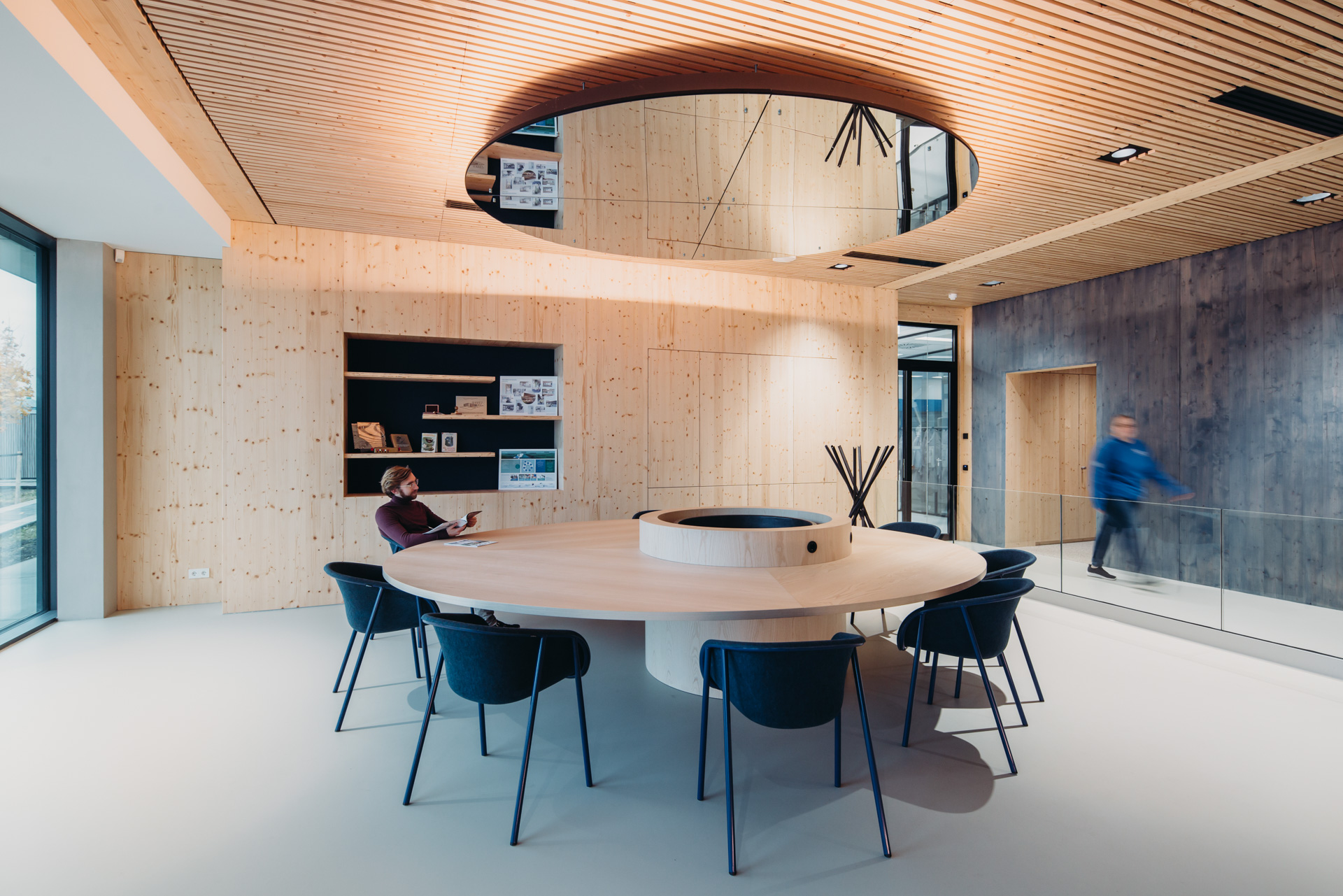 Het gebouw huisvest twee verschillende activiteiten en constructiesystemen: betonnen en stalen laboratoria, en een houten kantoorruimte. Twee werelden onder één dak, die door de architectuur met elkaar verbonden en versterkt worden. Met het interieurconcept proberen we een nieuwe laag toe te voegen aan het ontwerp. We brengen de kracht van diepere wateren met kleur- en textuuraccenten. Deze laag loopt door het hele gebouw, maar als een golf past het zich aan zijn context aan om ervoor te zorgen dat we de kwaliteiten en samenhang van het ontwerp behouden.