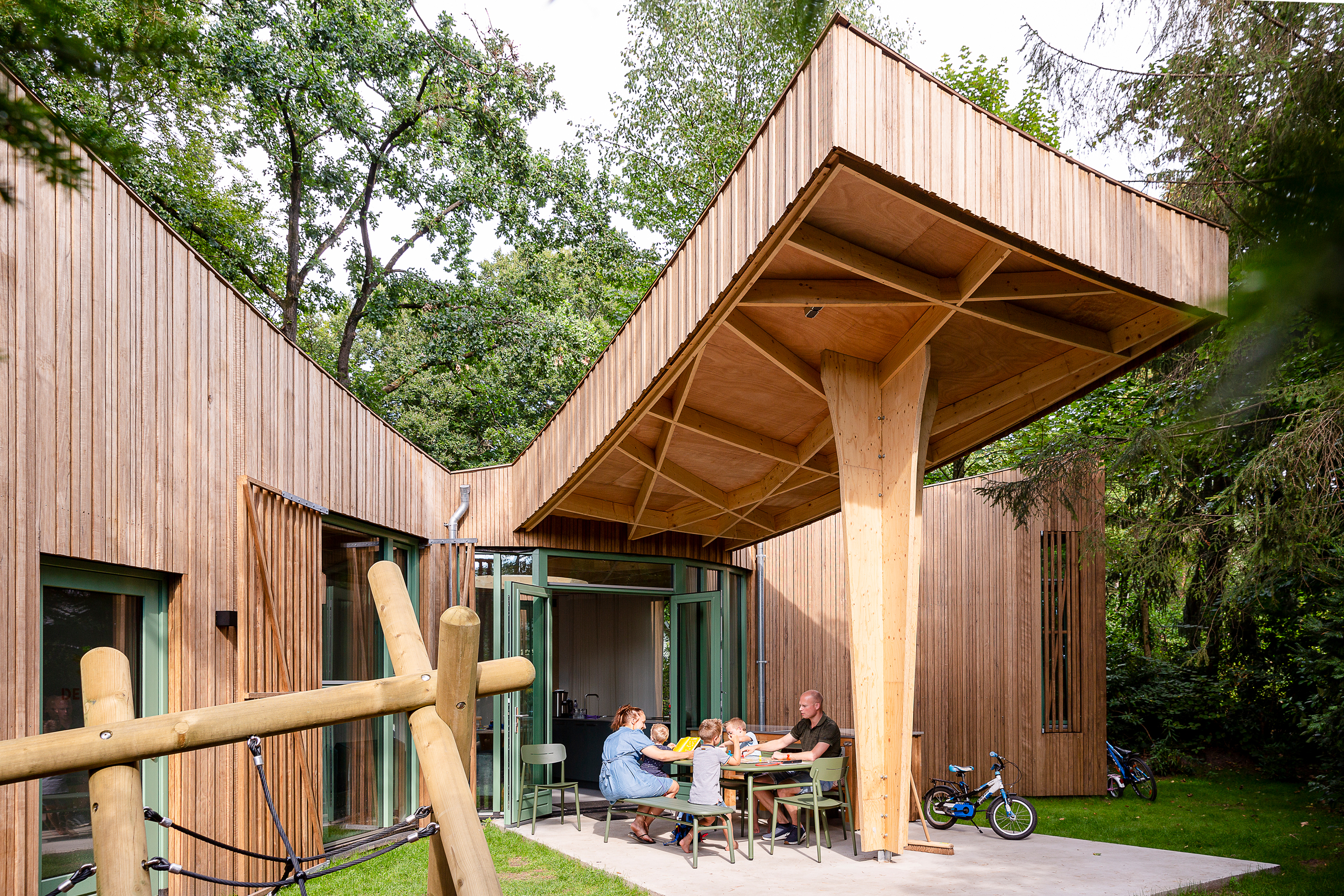 Het krommende houten dak van De Zon is qua vorm een echte eyecatcher, maar het heeft ook een belangrijke functie. Door de vrolijke holle vorm ontstaat er een intieme ruimte in het midden van het huis en meer hoogte en lucht in de stralen. Het dak lijkt net een vogelnestje en zo wordt het ook gebouwd! Met gekromde balken van verschillende lengtes, alsof ze zo bij elkaar gesprokkeld zijn. Een dikke knipoog naar de bosrijke omgeving van De Zon.