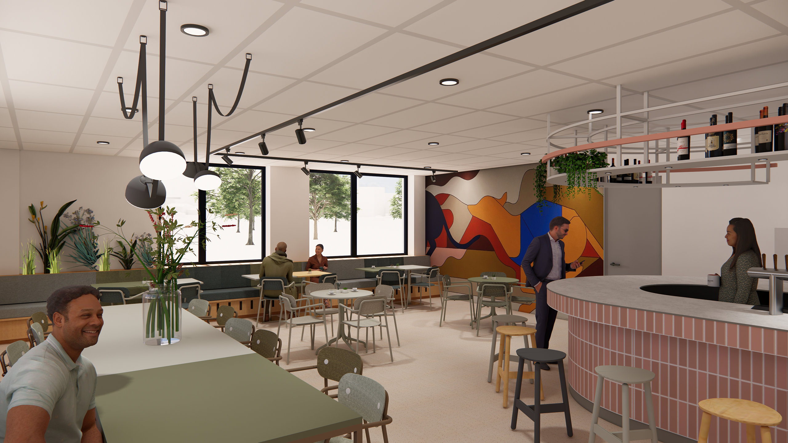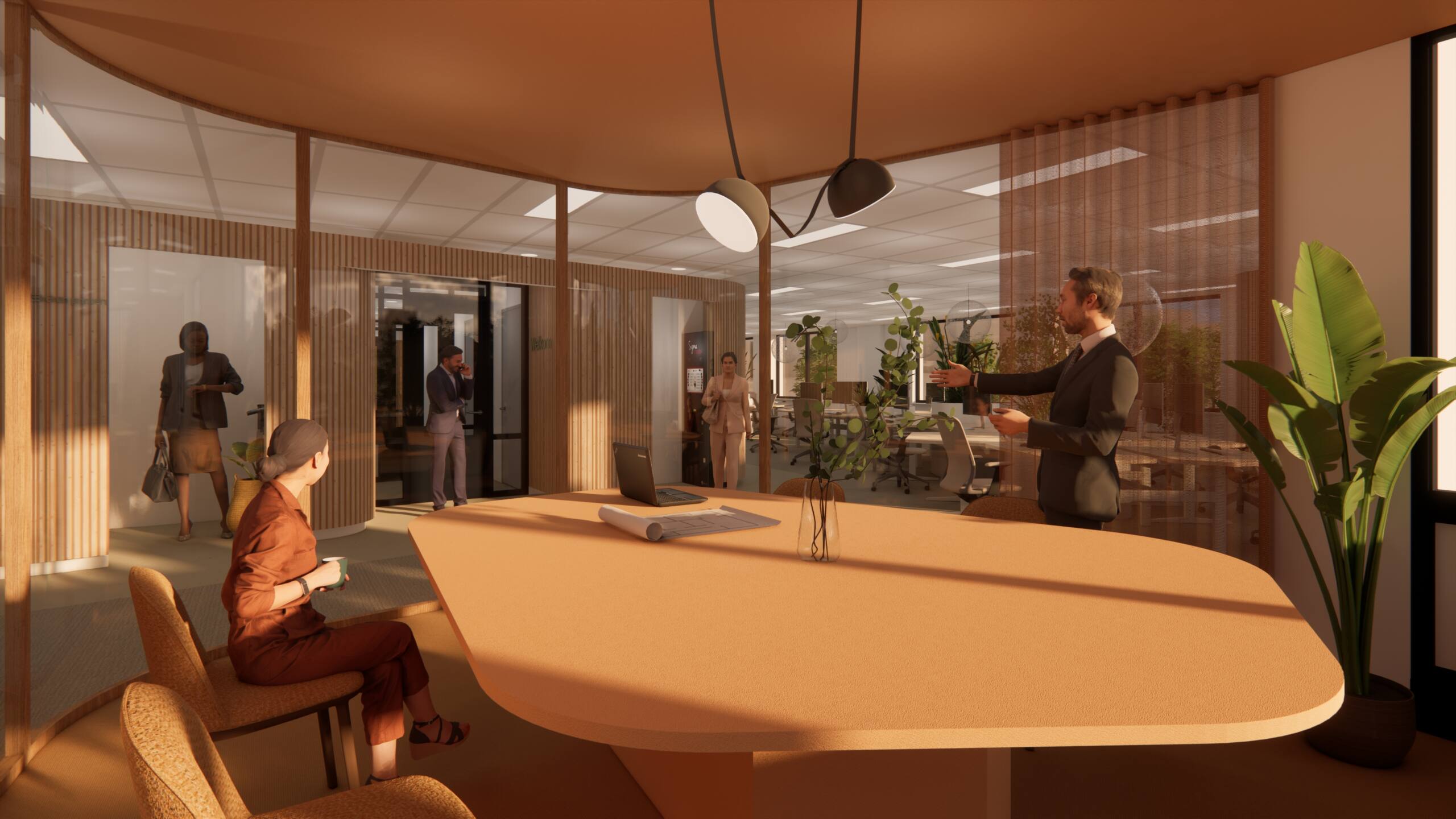 De tafels dikken op bij overleg en lopen slanker waar je wilt focussen. Los meubilair kan makkelijk worden verplaatst en opnieuw gevormd. Zo blijft de ruimte flexibel en uitnodigend, met zachte overgangen tussen werken en ontmoeten.