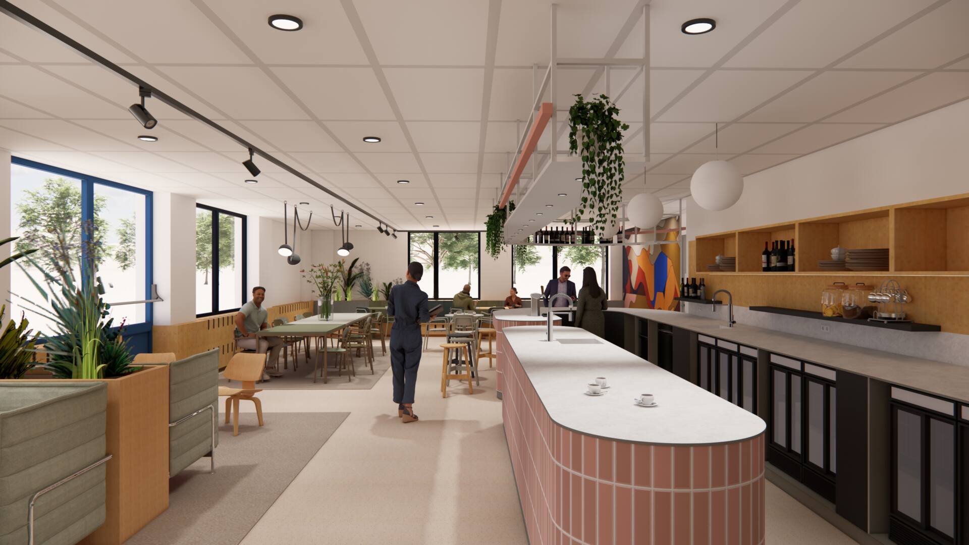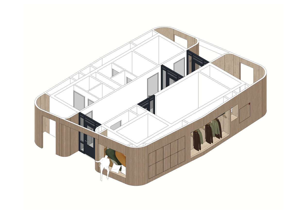 Rond de kern vouwt een vast meubel met koffie, kopieerplekken, garderobe en prikborden. Hier ontstaan vanzelf korte ontmoetingen en gesprekken. Zo zorgt de kern voor spontane sociale ontmoetingen en krijgt de ruimte een eigen, vertrouwd karakter.