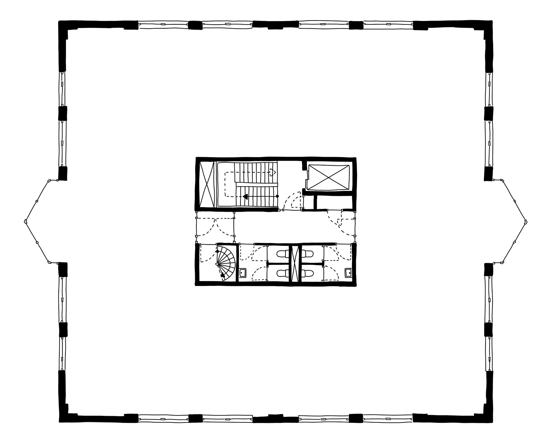 De kern van het gebouw vormt het middelpunt van de ruimte. Daaromheen vouwt zich een vast meubel met interieurelementen die richting geven aan het gebruik. Daarnaast verdelen de organische rustruimtes en vergaderruimtes in kleine en grotere plekken in de open ruimte, precies waar ze nodig zijn.