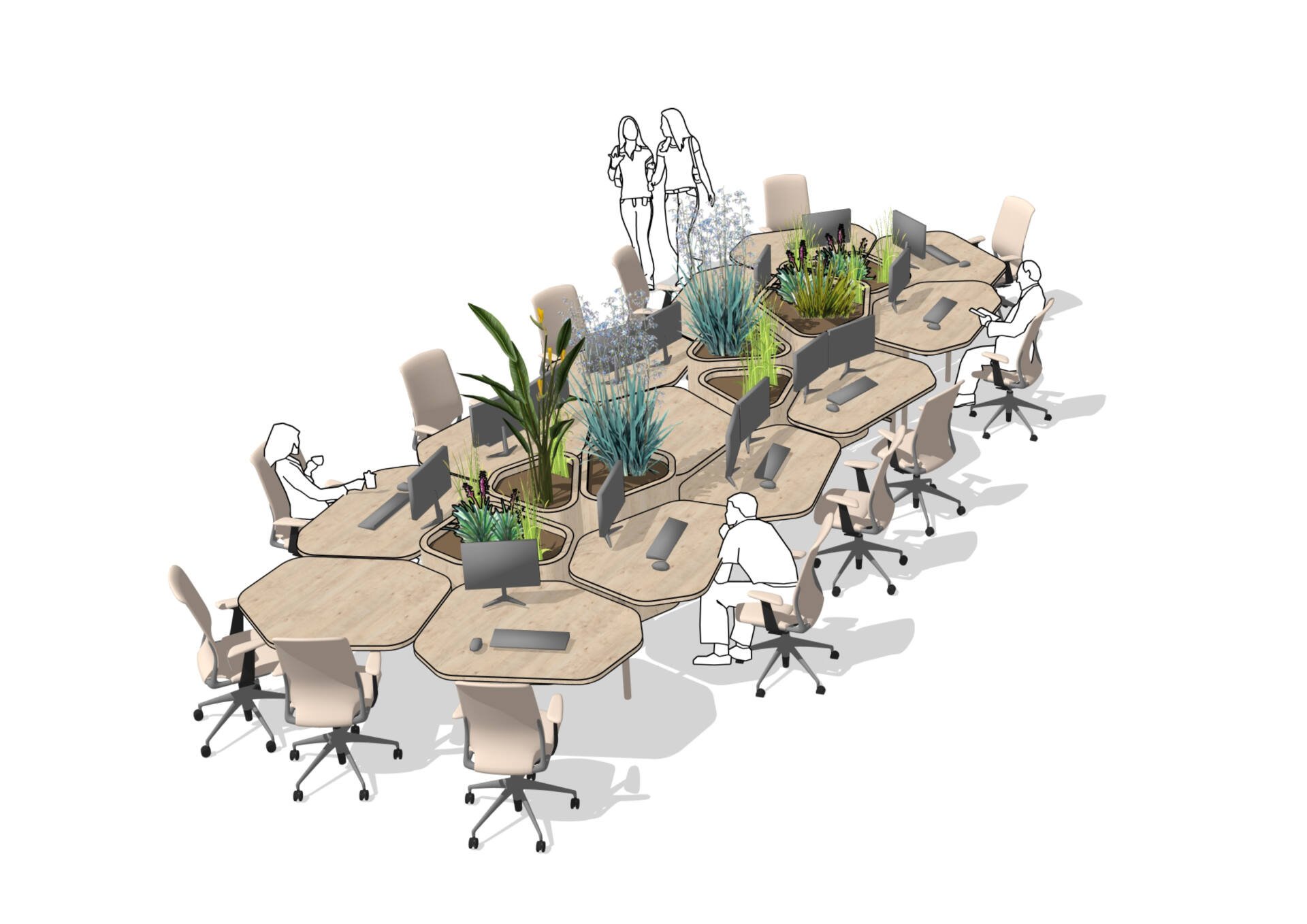KHN wilde werkplekken waar iedereen zicht thuis voelde. Dat vraagt voor een geïntegreerd ontwerp waarbij bestaande installaties en andere voorzieningen slim zijn opgenomen in het ontwerp. Plantenbakken brengen groen in de ruimte en functioneren tegelijk als hubs voor techniek en stroom.