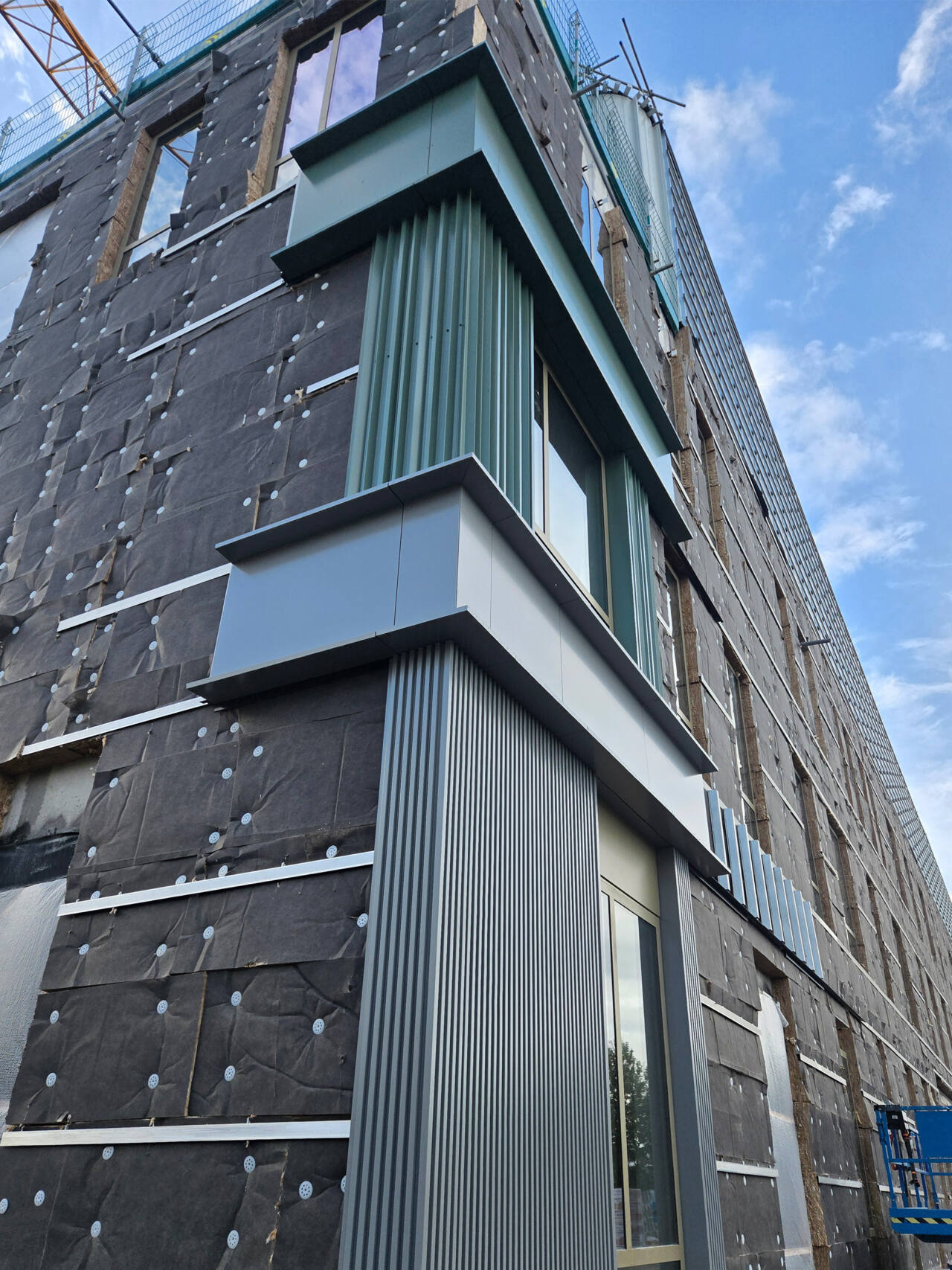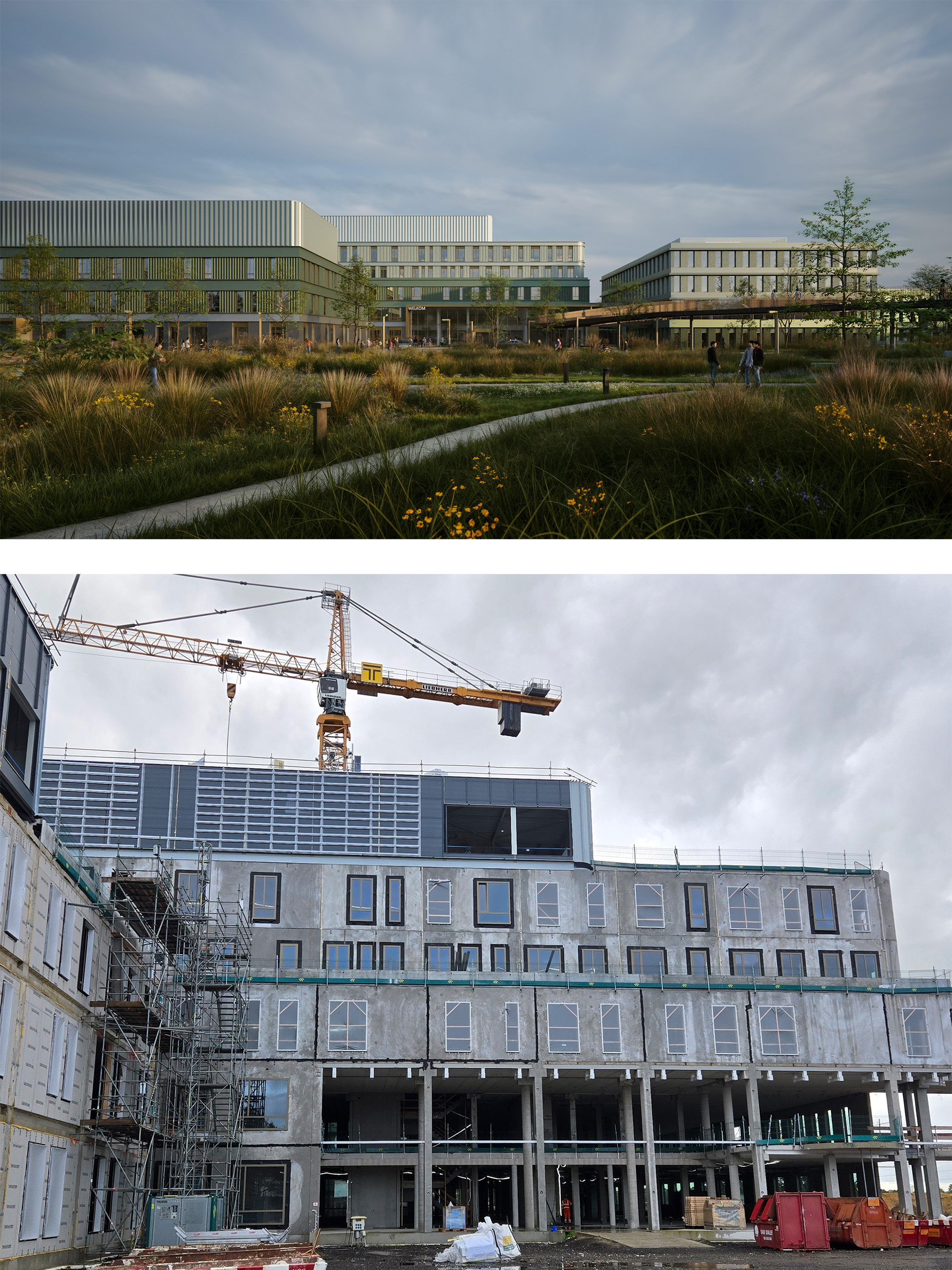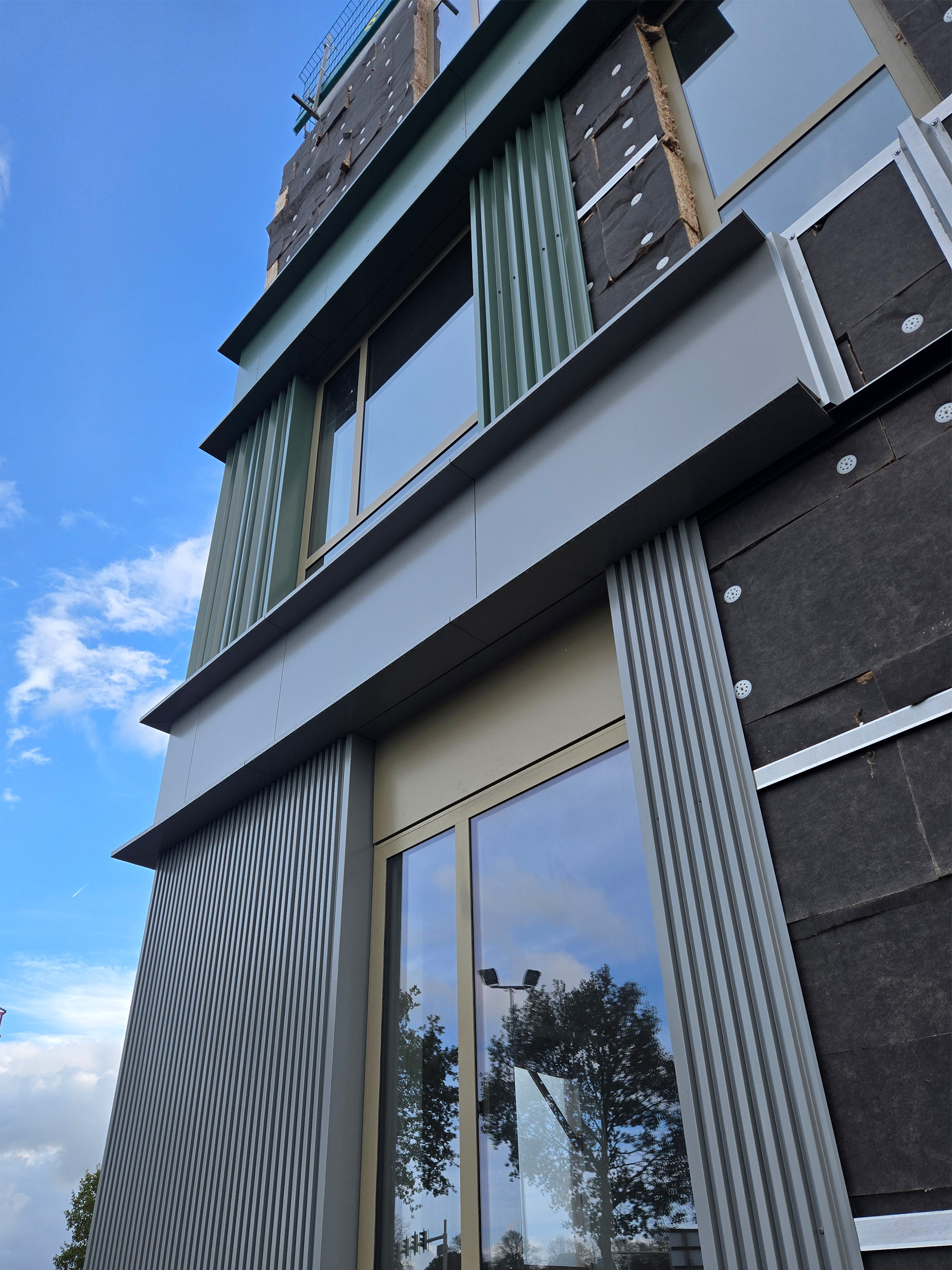 Het concept van de gevel is al goed zichtbaar. De gevel sluit zich aan bij het omliggende coulisselandschap. De aardse tinten bij de fundering lopen over in zachte groen-grijze tonen die je blik omhoog trekken naar de lucht. Horizontale banden houden het geheel samen, terwijl de verfijnde verticale lijnen mooi aansluiten bij het omliggende groen van het landschap.